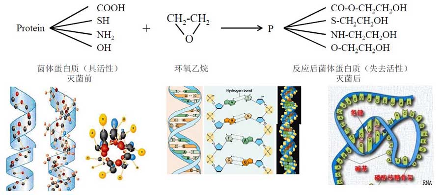 環(huán)氧乙烷在作用時(shí),其環(huán)狀結(jié)構(gòu)斷裂,經(jīng)羥化,與菌體內(nèi)蛋白質(zhì)上的氨基、羧基、羥基等活性基團(tuán)烷基化作用,使酶代謝過程發(fā)生障礙,從而破壞菌體的新陳代謝,造成微生物死亡,達(dá)到殺菌的目的。