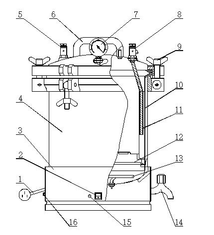 3、容器蓋上安裝有安全閥和放氣閥,當蒸汽壓力超過0.165Mpa時,安全閥能啟動釋放過高壓力,使之達到了使用上的安全,可靠,壓力表能顯示工作壓力和相對溫度,便于參照掌握滅菌時間。