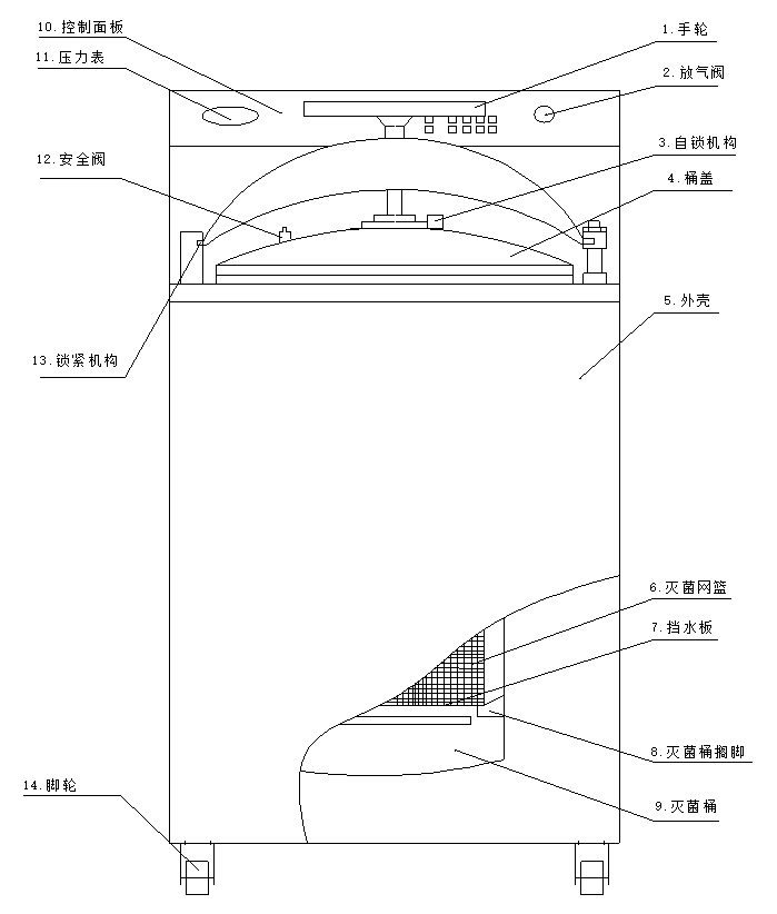 1、逆時針方向旋轉手輪(1)、向右拉開桶蓋(4)、取出滅菌網籃(6)、取出擋水板(7)。