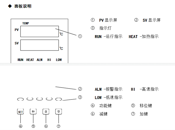 a. 在正常工作狀態下,按一下SET鍵,進入溫度設定狀態,此時PV顯示屏顯示SP,SV顯示屏**位閃爍; b. 按移位鍵將閃爍位移**所需設定位;