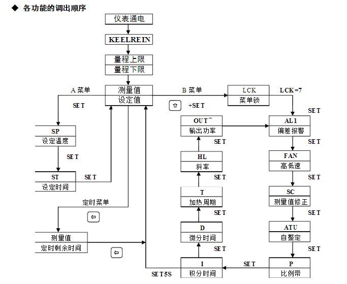 g. 在定時結束狀態下,按一下SET鍵,儀表恢復到正常工作狀態。 h. 在定時結束狀態下,由于儀表溫度控制部分停止工作,PV顯示屏顯示的測量值會下降到環境溫度,此為正常現象。