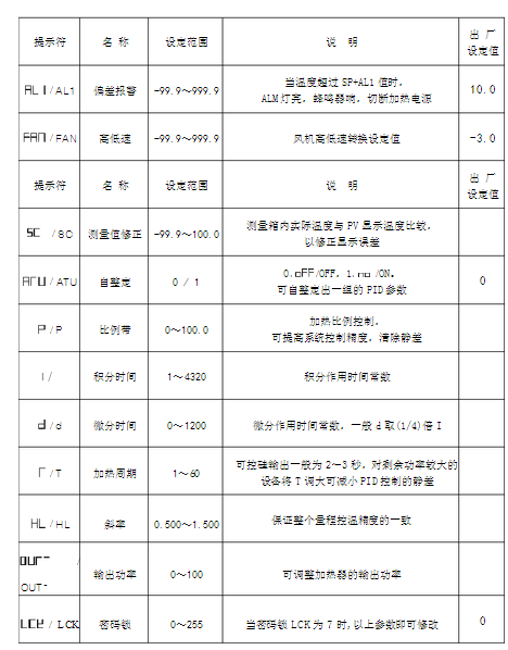 c. 按照控制參數調整方法,將自整定參數調整為1; d. 在正常工作狀態下,按住減鍵5秒鐘,即進入自整定狀態,此時PV顯示屏顯示ATU,并閃爍; e. 自整定結束后,儀表自動恢復到正常工作狀態。 f. 在自整定狀態下,按任何鍵均無效。  5. 控制參數調整方法 a. 同時按下加鍵和SET鍵,PV顯示屏顯示LCK; b. 按加鍵,使SV顯示屏顯示為7; c. 再按SET鍵,使PV顯示屏顯示需要調整的控制參數的提示符; d. 按加鍵或減鍵,使SV顯示屏顯示為該控制參數所需要的值,所有控制參數可以一次調整完畢; e. 再按SET鍵5秒鐘以上,回到正常工作狀態;此時溫度控制器執行新修改的參數。 注:控制參數調整過程中,若無鍵按下30秒,儀表自動恢復到正常工作狀態,但所改變的數據視為無效。  由于產品出廠前都經過嚴格地測試,一般不要進行修正。但是,在**次開機;產品使用一段時間;使用環境惡劣;使用的環境溫度與生產制造時的環境溫度不一致;使用控制溫度前后值改變時等等情況下,可通過修整功能參數從而達到出廠標準。                                 6. 測量溫度與箱內實際溫度的誤差修正方法 a. 將水銀溫度計(0.1℃精度的水銀溫度計)放入工作室內,水銀端應置于室內幾何中心位置;水銀溫度計的讀數即為實際溫度。 b. 開機,當設備運行**恒溫狀態(1~2小時左右),比較實際溫度與PV顯示屏顯示溫度的差值,其差(實際溫度-PV顯示值)即是測量值修正參數SC需要修改的值,即: SC=原始SC值+(實際溫度-PV顯示值) c. 根據上式計算SC值輸入即可。