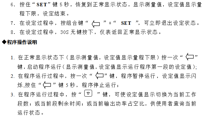 按“ ”或“ ”鍵,使該控制參數調到所需數值。d)在參數設定時,按“SET”鍵5S以上或30S無鍵按下,儀表回到正常顯示狀態。
