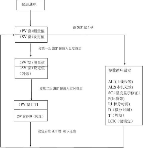 當(dāng)PV窗顯示T1時,進(jìn)入定時設(shè)定,出廠時SV窗為0000,表示定時器不工作,如不需要定時,即按SET鍵退出,如需定時1小時,可用移位鍵配好加鍵把SV窗設(shè)定為0060,定時2小時,設(shè)定為0120,以此類推。設(shè)定結(jié)束后,按SET鍵確認(rèn)退出。