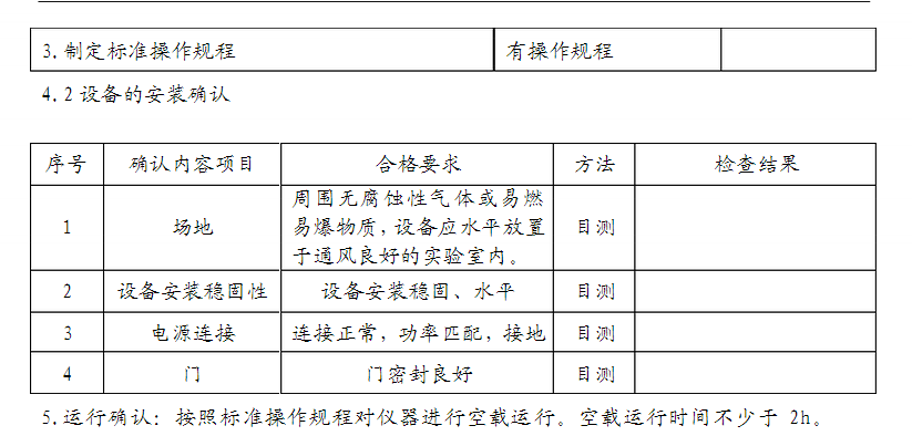 2.驗(yàn)證目的:通過對設(shè)備資料檢查,運(yùn)行、性能的確認(rèn),確保儀器的相關(guān)資料的齊全、完整,各項(xiàng)性能穩(wěn)定,從而保證檢驗(yàn)的準(zhǔn)確、可靠。 3.驗(yàn)證依據(jù):???? 4.設(shè)備的預(yù)確認(rèn) 4.1操作規(guī)程等資料確認(rèn)