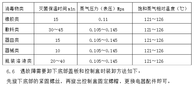 6.5  消毒物品所需的滅菌時間、蒸汽壓力/溫度對應關系見下表(僅供參考) 消毒物品所需滅菌時間、蒸汽壓力/溫度對應表(僅供參考)