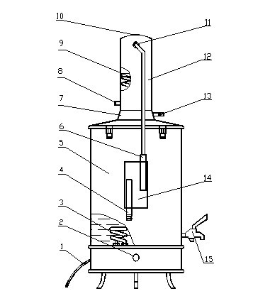 本儀器主要由冷凝器、蒸發鍋、電熱管三部分組成。主體材料均采用不銹鋼薄板與不銹鋼無縫管制成,外形美觀。電加熱管采用浸入式電熱管熱效率高。主要結構如下圖: